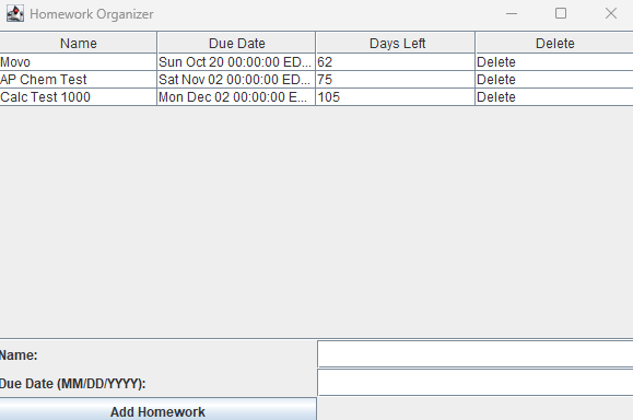 Java GUI to Track Homework Capable of Adding and Deleting Homeworks